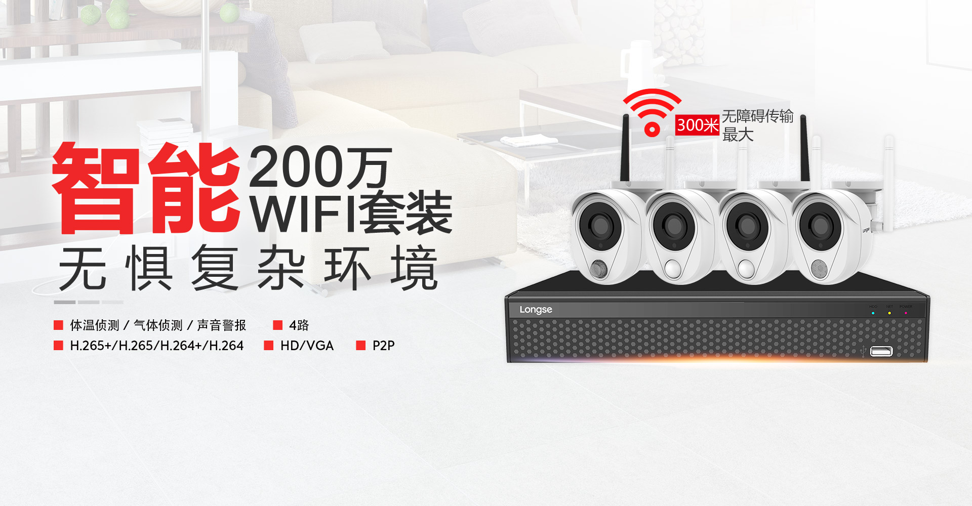 長(zhǎng)視200萬Wi-Fi智能監(jiān)控套裝,擁有PIR傳感器攝像機(jī)、氣體偵測(cè)攝像機(jī)、聲音報(bào)警攝像機(jī),